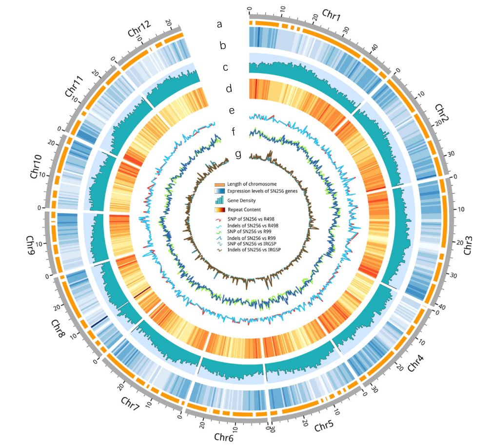 為了填補(bǔ)北方超級稻高質(zhì)量基因組序列的gaps,作者對SN265基因組進(jìn)行了de novo測序和組裝。利用P5-C3 SMRT測序,獲得24.94 Gb的原始數(shù)據(jù),平均讀長為9.6 kb,二代測序共獲得22.05 Gb的原始數(shù)據(jù),組裝得到SN265的基因組,大小為364.45 Mb,contig N50 達(dá)到6.96 Mb,通過從頭預(yù)測、同源預(yù)測以及RNA-seq分析后共獲得37,609個基因(圖2)。對R99進(jìn)行低深度(30×)三代重測序和基因組組裝,獲得了R99389.6 Mb的基因組,contig N50也達(dá)到3.05 Mb(圖2)。