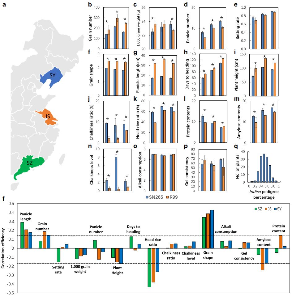 秈稻和粳稻為亞洲栽培水稻的兩個亞種,它們的地理分布以及形態(tài)學(xué)性狀差異明顯,揭示其農(nóng)藝性狀背后的遺傳基礎(chǔ)對于水稻生產(chǎn)非常重要,然而,其遺傳背景、生態(tài)條件以及農(nóng)藝性狀之間的關(guān)系尚不清楚。沈農(nóng)265(SN265)是我國第一個商用的超級稻,它作為中國北方骨干親本引領(lǐng)著育種方向。本研究利用二代和三代測序?qū)Ρ狈骄统壍維N265和R99進(jìn)行測序,并獲取SN265高質(zhì)量基因組,又構(gòu)建了RIL群體重測序遺傳連鎖圖譜,并對多個重要農(nóng)藝性狀進(jìn)行了QTL分析。此外,還發(fā)現(xiàn)若干基因功能隨生態(tài)環(huán)境的變化而改變,并且許多等位基因?qū)Σ煌倪z傳背景呈現(xiàn)差異性的響應(yīng)。