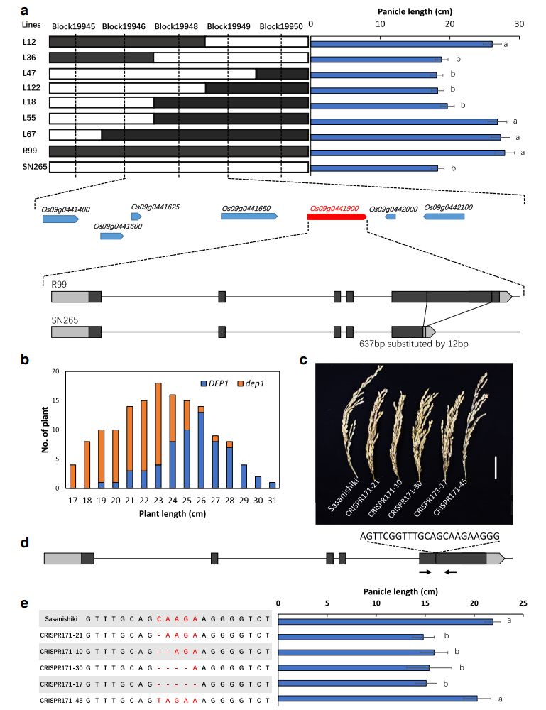 為了確定QTL簇的候選基因,進(jìn)一步做了基因的精細(xì)定位。首先,關(guān)注的是chr9上的 qPL9簇,候選基因被定位在43kb的區(qū)間內(nèi),其中包含7個注釋基因,通過序列比對分析發(fā)現(xiàn)一個候選基因DEP1上的exon5中存在堿基序列的替換,即R99中637bp的片斷在SN265中被替換成12bp的序列;接著共分離分析發(fā)現(xiàn)SN265型的dep1具有明顯短于R99的穗長(圖5)。為了證明DEP1qPL9的候選基因,利用 CRISPR/Cas9技術(shù)對Sasanishiki品種中的DEP1基因誘變,獲得五個突變體株系,其中四個突變體發(fā)生移碼突變,呈現(xiàn)短穗長,另外一個突變體產(chǎn)生兩個氨基酸的替換,其穗長與Sasanishiki無顯著性差異(圖5),暗示DEP1qPL9簇中控制穗長的基因。