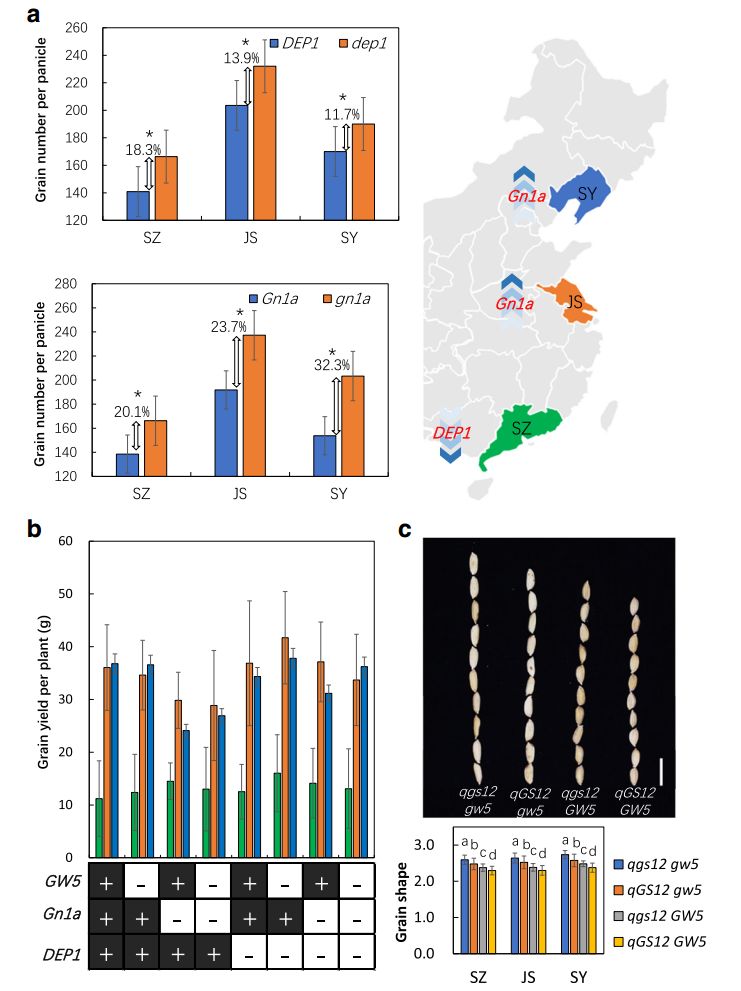 為了揭示生態(tài)環(huán)境與遺傳背景對基因功能的影響,首先,作者發(fā)現(xiàn)Gn1a對水稻單穗籽粒數(shù)目的貢獻(xiàn)主要集中在江蘇與沈陽兩個實驗點,而DEP1僅僅在深圳被檢測到是控制單穗籽粒數(shù)目的QTL(圖6)。對以上三個種植區(qū),又進(jìn)一步比較攜帶有 DEP1/dep1與Gn1a/gn1a的不同水稻材料,結(jié)果發(fā)現(xiàn)在高緯度生態(tài)區(qū)dep1對單穗籽粒數(shù)目的貢獻(xiàn)減少,而gn1a對其貢獻(xiàn)明顯增強(qiáng)(圖6)。類似地,DTH8、 SDG708與PHYB在江蘇均被檢測到,而PHYB在深圳也被檢測到,同樣, DTH8、 SDG708在沈陽也被檢測到;結(jié)果顯示DTH8、SDG708幾乎不會影響在深圳的抽穗期,PHYB在沈陽有較弱的作用(圖6)。概括起來,Gn1a、 SDG708、SD1與GW5的功能在高緯度地區(qū)被增強(qiáng),另一方面,PHYB與DEP1的功能隨著緯度的北移被破壞,有趣的是,DTH8在中緯度地區(qū)具有較強(qiáng)的功能,緯度的南移或北移都會削弱其功能。