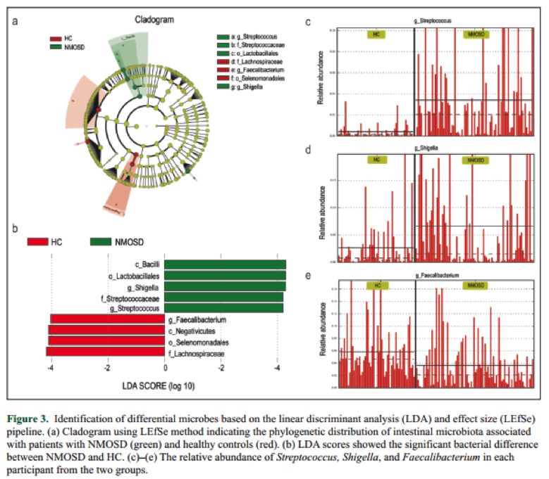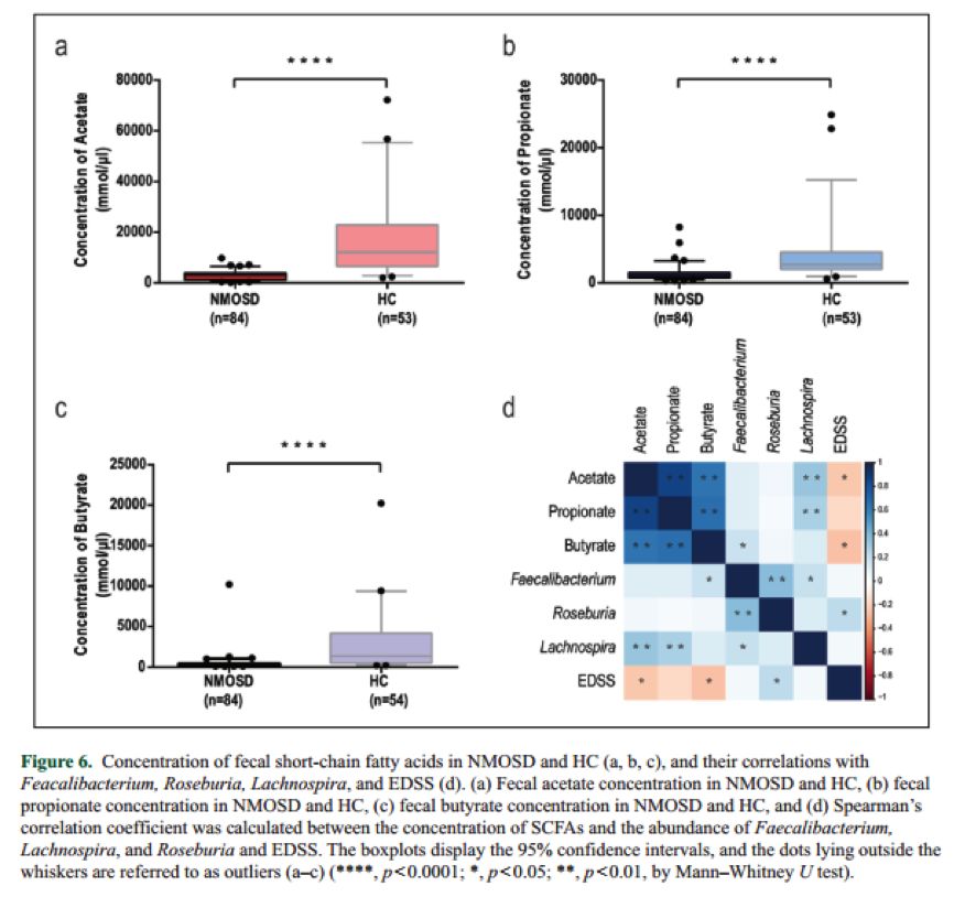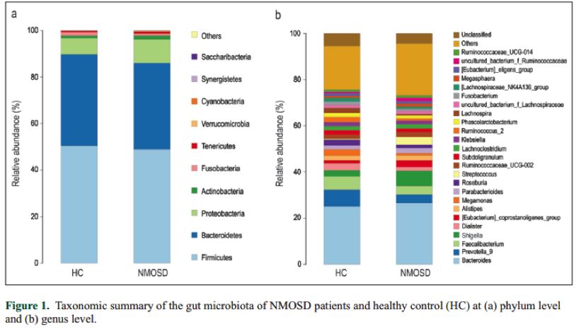 視神經(jīng)脊髓炎譜系疾病(NMOSD)是一種中樞神經(jīng)系統(tǒng)(CNS)的炎癥性自身免疫疾病,是視神經(jīng)和脊髓同時或相繼受累的急性或亞急性脫髓鞘病變。視神經(jīng)脊髓炎譜系疾病具有高復發(fā)和高致殘性,具有人種差異和性別差異(男女患病比例為1:10),通常與其他自身免疫疾?。ㄈ缦到y(tǒng)性紅斑狼瘡、橋本氏病等)共病。長期以來,NMOSD可通過免疫學標記(如水通道蛋白-4抗體,AQP4-IgG)或遺傳基因標記(如人類白細胞抗原,HLA)鑒定,與幽門螺桿菌等病原相關(guān)的抗體在NMOSD患者的腸胃中也被普遍發(fā)現(xiàn)。NMOSD患者腸道微生物的研究目前仍較少,本文采用高通量測序(NGS)和氣相色譜(GC)技術(shù),分析了NMOSD患者的腸道微生物與短鏈脂肪酸(SCFAs)變化情況。
