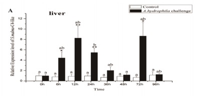 為探討這兩種免疫基因在細(xì)菌侵入的免疫應(yīng)答,采用定量實(shí)時(shí)PCR(qPCR)技術(shù),觀(guān)察注射后96h內(nèi)肝、脾臟相關(guān)基因的表達(dá)。對(duì)于鹽水處理組,即對(duì)照組,S.m-C4基因在研究的所有時(shí)間點(diǎn)肝臟中均無(wú)顯著差異(圖9)。對(duì)于嗜水氣單胞菌注射組,即實(shí)驗(yàn)組,肝臟在24小時(shí)有顯著增加(p=0.04),在12小時(shí)和72小時(shí)出現(xiàn)兩個(gè)峰值,邊緣顯著。在6h、12h、24h和72h,實(shí)驗(yàn)組與對(duì)照組有顯著性差異。對(duì)照組脾臟中S.m-C4基因的相對(duì)表達(dá)上下波動(dòng),8個(gè)時(shí)間點(diǎn)之間差異不顯著,實(shí)驗(yàn)組脾臟中S.m-C4基因的相對(duì)表達(dá)除72h外,其余時(shí)間點(diǎn)均無(wú)差異,與細(xì)菌注射組0 h相比減少59.6%。