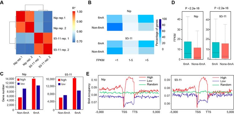 RNA-seq分析表明在Nip和93-11中,在6mA位點(diǎn)有大量的高表達(dá)基因甲基化,大量未甲基化基因在低水平表達(dá)。6mA甲基化基因的表達(dá)水平顯著高于非6mA基因,并且高表達(dá)基因顯示出較高的6mA占用率,特別是在啟動(dòng)子和基因體區(qū)域中包含6mA位點(diǎn)的基因。6mA與水稻中的活性表達(dá)基因有關(guān)。5mC在水稻基因組中高豐度存在,影響基因表達(dá),研究發(fā)現(xiàn)5mC和6mA之間沒有相關(guān)性(圖4)。