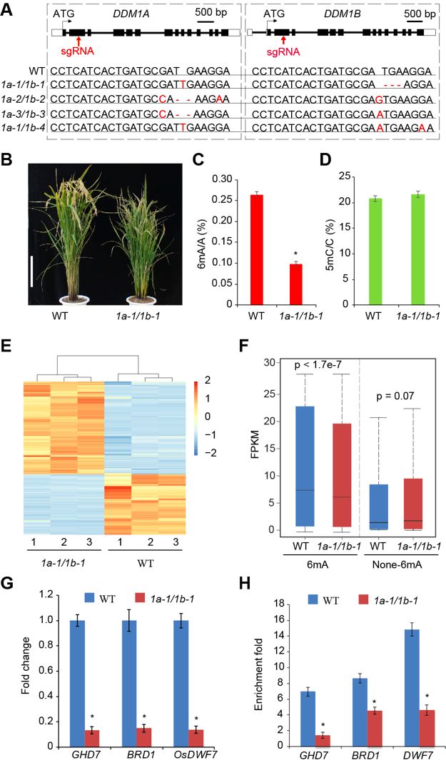 水稻基因組含有兩個(gè)DDM1同源基因DDM1a和DDM1b,由于功能冗余,只有T-DNA插入單突變體產(chǎn)生的雙突變體DDM1a/1b表現(xiàn)出發(fā)育表型。然而,DDM1a/1b不產(chǎn)生活花粉,導(dǎo)致種子呈空殼和深色。用CRISPR-Cas9對Nip背景中的DDM1a和DDM1b進(jìn)行了有針對性的誘變,并鑒定了10個(gè)獨(dú)立的T1系用于DDM1a、DDM1b單突變和4個(gè)獨(dú)立的DDM1a/DDM1b(1a/1b)雙突變型。在任何不同類型的DDM1a或DDM1b純合子單突變體中均未觀察到表型。與野生型植物相比,所有純合1a/1b系表現(xiàn)出相同的矮化表型。1a-1/1b-1顯示出降低的結(jié)實(shí)率,而另外3個(gè)雙突變體顯示不育。LC-MS/MS對DNA甲基化水平的定量測量顯示6mA水平顯著降低,但1a/1b植物中5mC水平變化不大。6mA-IPqPCR分析顯示,6mA水平在大多數(shù)隨機(jī)選擇的位點(diǎn)中顯著降低。RNA-seq結(jié)果表明野生型中6mA修飾基因的表達(dá)水平顯著高于1a-1/1b-1植物中的相同基因,野生型中非6mA基因與1a-1/1b-1植物中的相應(yīng)基因之間沒有表達(dá)水平差異。結(jié)果表明6mA水平與基因表達(dá)呈正相關(guān)。