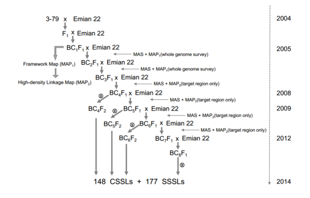著絲粒區(qū)域鑒定:blastn,SPSS software (version 17.0)?基因組共線性分析:MUMmer (version 3.23),GATK(version 3.1.1),Samtools(version 0.1.19)?MCScanX package結(jié)構(gòu)變異檢測:MUMmer3 (version 3.23);二倍體棉重測序SNPs鑒定:Trimmomatic (version 0.32)BWA168CSSLs群體SNPs鑒定:染色體片段置換系(CSSLs)的構(gòu)建(圖1),測序深度(6X),插入片段:350 bp,BWAGATKSamtoolsCSSLs群體QTLs定位與表達分析:QTL IciMapping (version 4.0)?;TopHat2 (version 2.0.13)?;Cufflinks (version 2.2.1);STRUCTURE (version 2.3)?TASSEL software (version 5.0)?;