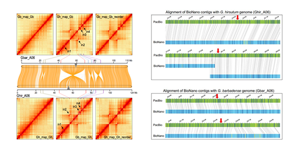 3?陸地棉和海島棉A06染色體倒位鑒定(左:Hi-C互作熱圖;右:光學圖譜鑒定)