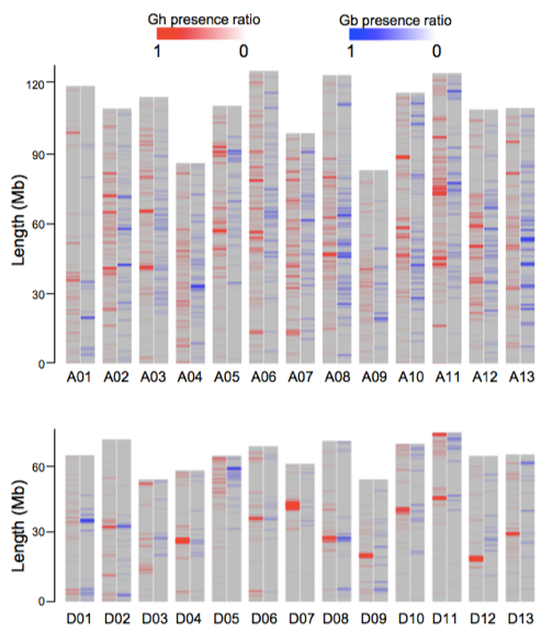 通過陸地棉(Gossypium hirsutum)和海島棉(Gossypium barbadense)兩種栽培棉種質(zhì)基因組的重新組裝,研究人員鑒定了大量的變異,這些變異應與其它種質(zhì)的基因組分析相結(jié)合,以充分挖掘兩種種質(zhì)基因組間的差異。研究人員通過構(gòu)建滲入系,在兩種代表性種質(zhì)間探索研究了具有潛在優(yōu)質(zhì)纖維質(zhì)量性狀的基因組序列信息,而這在棉花育種中,可用于理想性狀的培育;這些資源將極大的促進棉花功能基因組學與進化基因組學的研究,并將為棉花纖維質(zhì)量的改良提供信息。