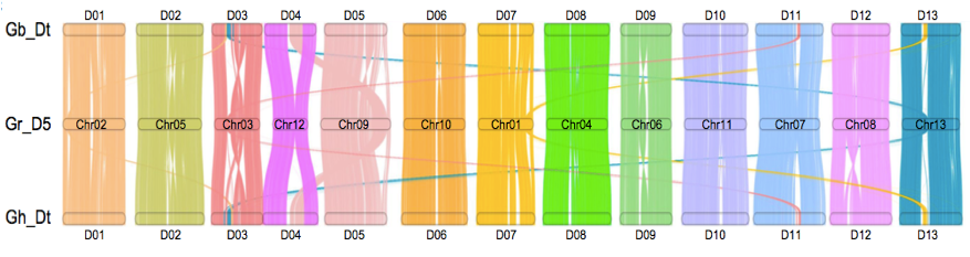 四倍體陸地棉和海島棉基因組的組裝使得研究人員能夠進一步探索四倍體棉亞基因組和其二倍體祖先之間的基因組差異。首先通過對具有D型基因組的13份二倍體材料進行重測序分析,分析顯示在兩種四倍體棉D-亞基因組具有相同的二倍體祖先種雷蒙德氏棉G. raimondiiD5 genomeD亞基因組供體);進而利用二倍體雷蒙德氏棉G. raimondii直接進行基因組比較分析,發(fā)現(xiàn)四倍體陸地棉和海島棉與雷蒙德氏棉相比,都有一些獨特的結(jié)構(gòu)變異,如在海島棉染色體D05和陸地棉D12中均存在大的染色體臂間倒位,暗示這些變異出現(xiàn)在多倍化之后(圖5)。研究人員還觀察到兩個四倍體相對于G. raimondii共有一些結(jié)構(gòu)變異,例如染色體D09中兩個四倍體發(fā)生了大的反轉(zhuǎn)(圖5)。研究中同時運用了二倍體祖先種亞洲棉G. arboreumA2 genomeA亞基因組供體)的Hi-C數(shù)據(jù),與陸地棉和海島棉A亞基因組進行比對,檢測棉由二倍體到四倍體多倍化過程中發(fā)生的結(jié)構(gòu)變異,Hi-C具體矩陣圖顯示在13條染色體中發(fā)生了大規(guī)模的染色體重排,其中發(fā)部分變異為兩個四倍體的棉的A亞基因組共有。研究中發(fā)現(xiàn)染色體A06中*大的染色體臂間倒位(in2)在陸地棉中是特有的(圖3?左),表明這種結(jié)構(gòu)變異可能在染色體多倍化后發(fā)生。因此得出結(jié)論,二倍體棉花中的A基因組在異源多倍化后被重組,導致不同四倍體(陸地棉和海島棉)中發(fā)生了大染色體倒位。