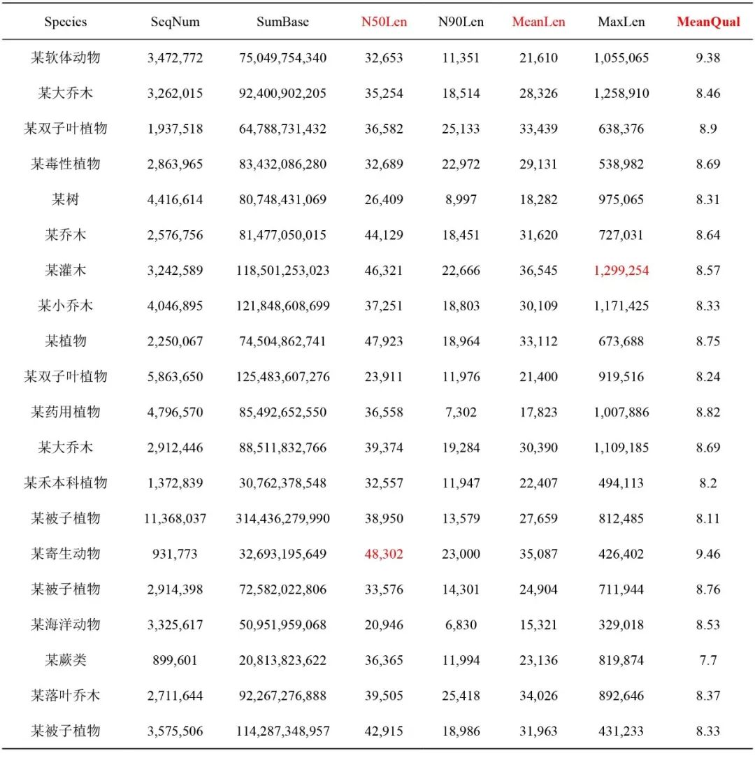 注:Species:分析的物種信息;SeqNum:各個長度范圍內(nèi)序列的數(shù)目;SumBase:指各個長度范圍內(nèi)序列的總長度;N50Len:reads N50長度;N90Len:readsN90長度;MeanLen:平均reads長度;MaxLen:最長reads長度;MeanQual:質(zhì)量值。