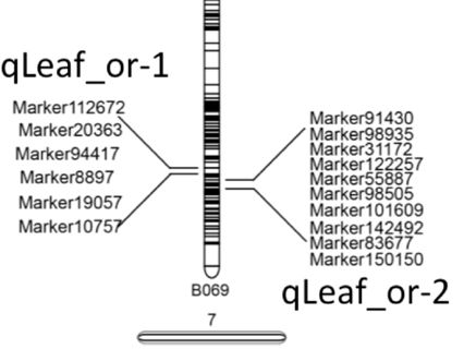 在本研究中,利用葉形存在明顯差異的兩個材料PS002和?PS047雜交得到的F2群體,利用145個單株構(gòu)建SLAF-遺傳圖譜,7146個上圖標簽,總圖距1120.81cM,平均圖譜為0.16cM。結(jié)合F2代表型數(shù)據(jù)利用此圖譜共挖掘到兩個葉形QTL(qLeaf_or-1, qLeaf_or-2),并同時在F2群體中選擇了2個極端混池,每個池含有30個子代,運用SLAF-BSA的方法驗證到這兩個位點與葉形性狀緊密關(guān)聯(lián),并檢測到許多其他與葉形性狀關(guān)聯(lián)的分子標記。此外,利用這些SLAF標簽序列與蒺藜苜蓿、鷹嘴豆、大豆基因組進行近緣物種共線性分析,發(fā)現(xiàn)無參物種豌豆與蒺藜苜蓿更為相近。SLAF-遺傳圖譜和SLAF-BSA聯(lián)合分析有利于排除標記假陽性,該方法獲得的基因組信息龐大,對于復(fù)雜的無參物種遺傳位點挖掘具有較好的效果。