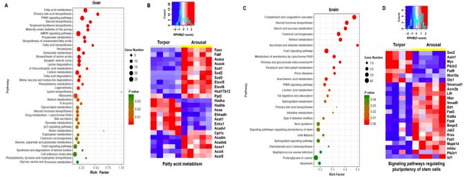 與其它高原哺乳動(dòng)物不同,喜馬拉雅旱獺在冬季冬眠。為了闡述旱獺冬眠的分子機(jī)制,研究人員分析了來(lái)自喜馬拉雅旱獺肝臟和大腦的RNA-seq數(shù)據(jù),以表征在冬眠/覺(jué)醒周期中基因表達(dá)的變化。差異表達(dá)的基因(DEGs)顯著富集在肝臟中脂肪酸代謝,萜類骨架生物合成和初級(jí)膽汁酸生物合成的途徑(圖3 A)。并清楚地觀察到在冬眠狀態(tài)下,參與脂肪酸降解的基因的上調(diào)及參與脂肪酸合成的基因的下調(diào),暗示了一個(gè)√確的脂質(zhì)代謝調(diào)節(jié)機(jī)制(圖3 B)。此外,還發(fā)現(xiàn)在覺(jué)醒狀態(tài)下,包含與藥物代謝相關(guān)的基因-細(xì)胞色素P450,氨基酸的生物合成和碳水化合物分解代謝相關(guān)基因的總體下調(diào)。