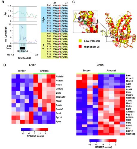 為了更好地了解喜馬拉雅旱獺的高原適應(yīng)性機(jī)制,研究人員從極高海拔(海拔> 4,500 m,n = 10)和相對(duì)低海拔(<1,900 m,n = 10)收集了20只喜馬拉雅旱獺。研究人員首先測(cè)量了血液參數(shù),發(fā)現(xiàn)與低海拔喜馬拉雅旱獺相比,高海拔喜馬拉雅旱獺的一些血液相關(guān)性狀,尤其是紅細(xì)胞計(jì)數(shù),血紅蛋白濃度和平均紅細(xì)胞體積顯著增加。接下來(lái),對(duì)每個(gè)喜馬拉雅旱獺進(jìn)行了全基因組測(cè)序,并在喜馬拉雅旱獺基因組中搜索了具有高種群分化(Fst)和多樣性比率(qp,low/qp, high)的區(qū)域,最終鑒定了分布在喜馬拉雅土撥鼠基因組不同scaffolds?中的24.84 Mb受選擇的區(qū)域。這些區(qū)域含有383個(gè)功能基因,與非選擇性基因相比,這些基因具有更高的Ka / Ks值(P <0.01),主要功能類別包括“缺氧反應(yīng)”,“DNA修復(fù)”,“血管生成”,“心臟功能”,“脂肪酸代謝”,“細(xì)胞周期”,“發(fā)熱”和“鈣信號(hào)通路”。參與缺氧誘導(dǎo)因子-1(HIF-1),血管內(nèi)皮生長(zhǎng)因子(VEGF)或其它缺氧相關(guān)信號(hào)通路的10個(gè)功能基因,包括Slc25a14,Nox-1,Hmox1,Vegfr2,Atg16l2,Bex1,Ptgr2,Gprasp1,F(xiàn)am46d?和Chd3,在高海拔和低海拔群體之間顯示出明顯的基因分型差異(圖4 A)。在Slc25a14中發(fā)現(xiàn)了非同義替換(由Ser28取代Phe28,F(xiàn)28S),其顯示出*強(qiáng)的分化信號(hào)(FST = 0.73)(圖4 A和B)?;谕唇5腟lc25a14的三維結(jié)構(gòu)顯示,F(xiàn)28S替換發(fā)生在N末端的loop區(qū)域,并且由于氨基的電荷和極性的變化而增加其與相鄰的α-螺旋的距離(圖4 C)。為了進(jìn)一步評(píng)估這一變體的功能影響,研究人員將突變體Slc25a14與其在不同哺乳動(dòng)物中的直系同源基因進(jìn)行比對(duì),并發(fā)現(xiàn)Phe28在比對(duì)的其它動(dòng)物中高度保守。該突變體功能影響的預(yù)測(cè)證明F28S取代是有害的,所有這些結(jié)果都表明F28S突變可能是高海拔群體Slc25a14選擇性清除的結(jié)果。為了推測(cè)旱獺高海拔適應(yīng)和冬眠的遺傳適應(yīng)性機(jī)制,研究人員在選擇性清除區(qū)域鑒定到了116個(gè)差異表達(dá)基因,在這些基因中,25個(gè)差異表達(dá)基因與HIF-1途徑相關(guān),主要屬于DNA修復(fù),血管生成,脂肪酸代謝,細(xì)胞凋亡/細(xì)胞周期和發(fā)熱的類別相關(guān)。在冬眠/覺(jué)醒周期中,大量選擇性清除基因具有差異表達(dá),表明這兩種生物學(xué)過(guò)程之間存在共同的遺傳影響(圖4 D)。在這些基因中,Bex1, Apln, kcne1l, Med12, Dad1和Fgf16在冬眠階段肝臟或腦中顯著上調(diào)(圖4 D),進(jìn)一步證明這些基因參與冬眠和高原適應(yīng)性,先前的研究報(bào)道了這些基因參與許多生理過(guò)程,包括神經(jīng)元分化,肝再生,血管生成和能量代謝,而這需要進(jìn)一步的實(shí)驗(yàn)驗(yàn)證。