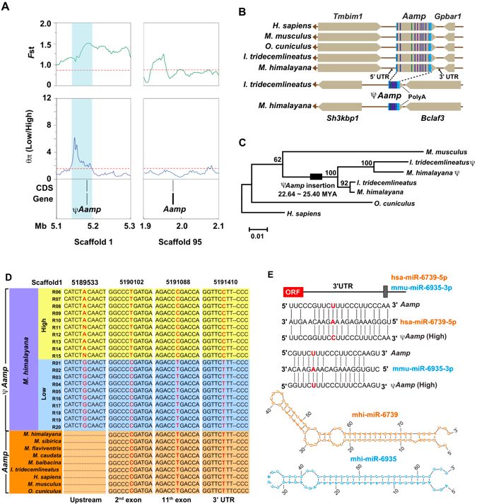 假基因逐漸被認(rèn)定為是適應(yīng)性表型多樣化的重要調(diào)節(jié)因子,與選擇性清除信號(hào)相關(guān),研究人員鑒定了27個(gè)參與極高海拔適應(yīng)的候選假基因,占全基因組范圍內(nèi)假基因的1.83%。這一比率幾乎與具有1.78%的功能基因的比率相當(dāng),表明它們?cè)跇O端環(huán)境的適應(yīng)性中的作用不可忽略。與蛋白質(zhì)編碼基因中發(fā)現(xiàn)的群體基因型差異一致,研究人員在高海拔群體中觀察到受選擇的假基因中幾乎固定的突變,例如ΨAamp,ΨAdl1和ΨRnf114。在這些假基因中,血管相關(guān)的遷移細(xì)胞蛋白假基因(ΨAamp)具有完整的基因結(jié)構(gòu)并顯示出*高的Fst值(Fst = 0.67),但ΨAamp未被檢測(cè)為受選擇性基因(圖4 A和5 A)。ΨAamp的結(jié)構(gòu)顯示它是一個(gè)整合的加工假基因,其mRNA通過(guò)逆轉(zhuǎn)錄被插入基因組中(圖5 B)。這個(gè)假基因含有過(guò)早終止密碼子(第208個(gè)核苷酸,C> T),缺失/插入和移碼突變,使其不能翻譯成功能性的蛋白,Aamp和ΨAamp的共線性分析表明在不同哺乳動(dòng)物中Aamp是高度保守的。然而,在地松鼠和喜馬拉雅旱獺中發(fā)現(xiàn)并保存了高度保守的共線性位點(diǎn)(圖5 B),進(jìn)一步的系統(tǒng)發(fā)育分析表明,ΨAamp和Aamp屬于兩個(gè)獨(dú)立的分支,基于序列分歧插入時(shí)間的估算暗示假基因的插入事件發(fā)生在約22.64~25.40 MYA,在喜馬拉雅旱獺和地松鼠分化之前(圖?5 C)。這些發(fā)現(xiàn)支持古老的假基因?qū)τ谒墒缶哂刑禺愋圆墓餐淖嫦冗z傳而來(lái)這一假設(shè),然而,與地松鼠相比,喜馬拉雅旱獺顯示Aamp和ΨAamp之間的序列距離較小,這表明存在選擇性壓力來(lái)維持旱獺的遺傳元素。