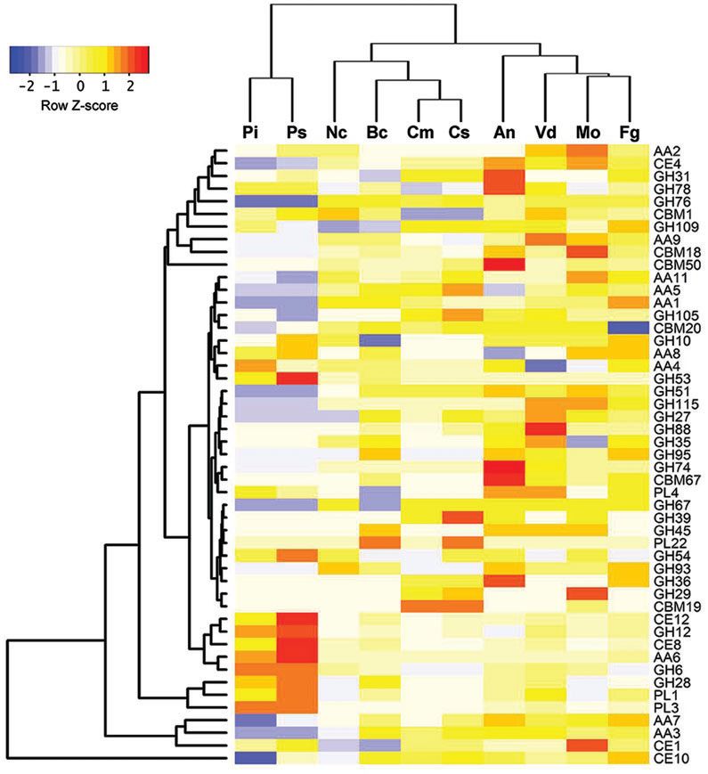 成熟的植物致病真菌可以分解并利用CAZymes的植物細胞壁多糖。尾孢菌(Cercospora sojina)含有596個預(yù)測的CAZymes。與其他真菌相比,C.sojina具有更大的潛在碳水化合物酯酶組,其可催化取代糖的N-去?;?。在C. sojina基因組中,有大約23.5%的潛在分泌蛋白被預(yù)測為CAZyme,證明C.sojina可能在入侵期間使用大量CAZymes來消化宿主細胞壁。有趣的是,其中一個CAZymes家族,即糖苷水解酶GH109家族,是高度富集的(圖6)。