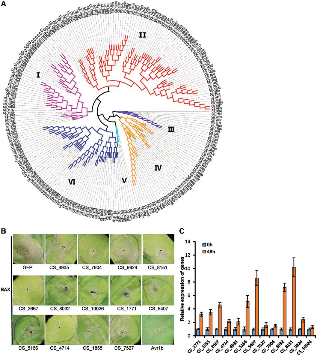 因此,我們嘗試研究效應(yīng)器功能。促凋亡小鼠蛋白BAX誘導(dǎo)的本氏煙草程序性細胞死亡(PCD)在生理上可能與病原體引起的防御相關(guān)的過敏反應(yīng)相似,提供了有價值的篩查可以抑制與防御相關(guān)的PCD的效應(yīng)物的方法。我們隨機選擇50個效應(yīng)子并在本塞姆氏煙草中瞬時表達它們以篩選可以抑制BAX觸發(fā)的PCD(BT-PCD)的潛在效應(yīng)物。結(jié)果表明,約1/4選擇的效應(yīng)子強烈抑制BT-PCD(圖7B)。此外,qRT-PCR結(jié)果顯示,大多數(shù)這些推定的效應(yīng)子在C.sojina感染后48小時被轉(zhuǎn)錄誘導(dǎo)(圖7C),這意味著它們可能有助于大豆灰斑病的早期感染。