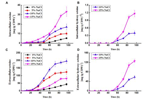 將重組質(zhì)粒轉(zhuǎn)入大腸桿菌中,發(fā)現(xiàn)在15%的NaCl緩沖液中,四氫嘧啶很難產(chǎn)生,并在0%的緩沖液中檢測到少量四氫嘧啶。在10%和15%的鹽濃度環(huán)境下,四氫嘧啶的合成速率分別在24h和48h中顯著下降,其最大合成速率為[0.5 mg (g CDW)?1?h?1],而最終產(chǎn)出[28.85 mg (g CDW)?1]?。