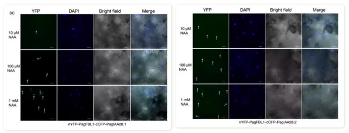 使用雙分子熒光互補技術(shù),將15個Aux/IAA基因共轉(zhuǎn)染到煙草葉片,發(fā)現(xiàn)只有在nYFP-PagFBL1與?cCFP-PagIAA28.1?和cCFP-PagIAA.28.2共轉(zhuǎn)染后(圖5a)才會發(fā)現(xiàn)YFP熒光蛋白信號,且生長素濃度越高,信號越強,而在其他組合中,只發(fā)現(xiàn)了DAPI信號(圖5b)。