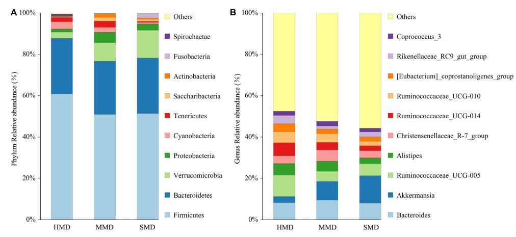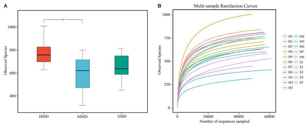 1、試驗材料:選擇了4-6歲的成年森林麝鹿,包括8只健康麝(HMD)(編號H1-H8),8只輕度腹瀉麝(MMD)(編號M1-M8),和5只嚴重腹瀉的麝(SMD)(編號S1-S5)。共收集了21份糞便樣本。2、試驗方法:Illumina HiSeq 2500?,16SV3+V4