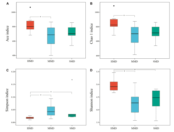 麝鹿糞便樣本中Alpha多樣性指數(shù)(Ace,Chao 1,Simpson和Shannon)(圖2)和健康和腹瀉的樣本β多樣性指數(shù)統(tǒng)計結(jié)果顯示:HMD和MMD之間的Ace、Chao 1、Simpson和Shannon指數(shù)存在顯著差異(P <0.05)。MMD和SMD之間沒有顯著性差異。HMD和SMD的比較發(fā)現(xiàn)有顯著性差異(P <0.05)。