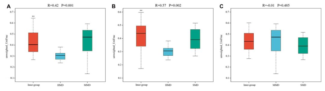 組間和組內(nèi)β距離在箱型圖中顯示(圖4),結(jié)果表明HMD和MMD組(圖4A)之間以及HMD和SMD組之間細菌群落的極顯著差異(圖4B)(?P <0.01)。
