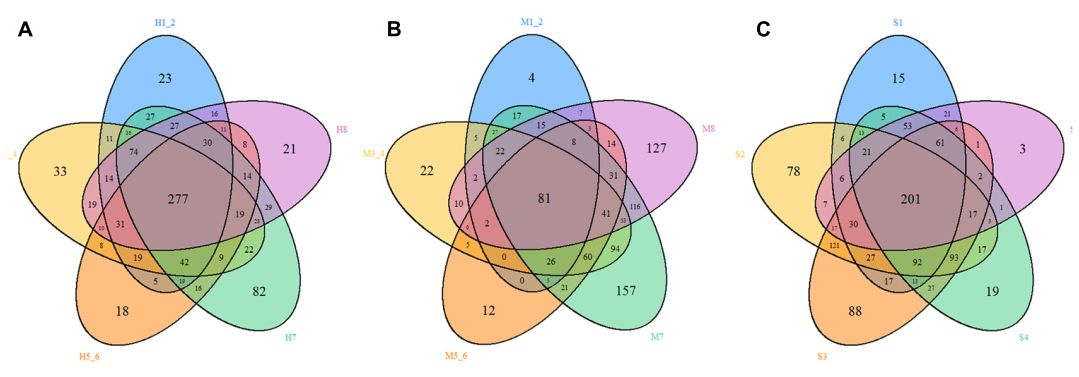 物種分類柱狀圖是表示HMD、MMD和SMD樣本中物種的組成及對應物種在該樣本中的相對豐度。HMD、MMD和SMD樣本中在門水平和屬水平相對豐度前10的物種如圖5所示。無論是否存在腹瀉的樣本中,厚壁菌和擬桿菌都是主要的優(yōu)勢菌。然而,健康森林麝的糞便中厚壁菌的相對豐度明顯高于腹瀉麝。厚壁菌是構(gòu)成食物中纖維素分解代謝并將纖維素降解為宿主揮發(fā)性脂肪酸的主要細菌類型。此外,厚壁菌門還可以調(diào)節(jié)體內(nèi)免疫反應,抑制病原體的侵襲和預防腸道炎癥。腹瀉麝腸道中厚壁細胞豐度的減少可能會同時降低該物種的消化生理功能。另外,β多樣性的比較顯示,健康和腹瀉森林麝的細菌群落差異極顯著,這與麝的異常消化生理功能有關(guān)。HMD、MMD和SMD三組不同樣本之間共有OTU和特有OTU數(shù)量如圖6所示。
