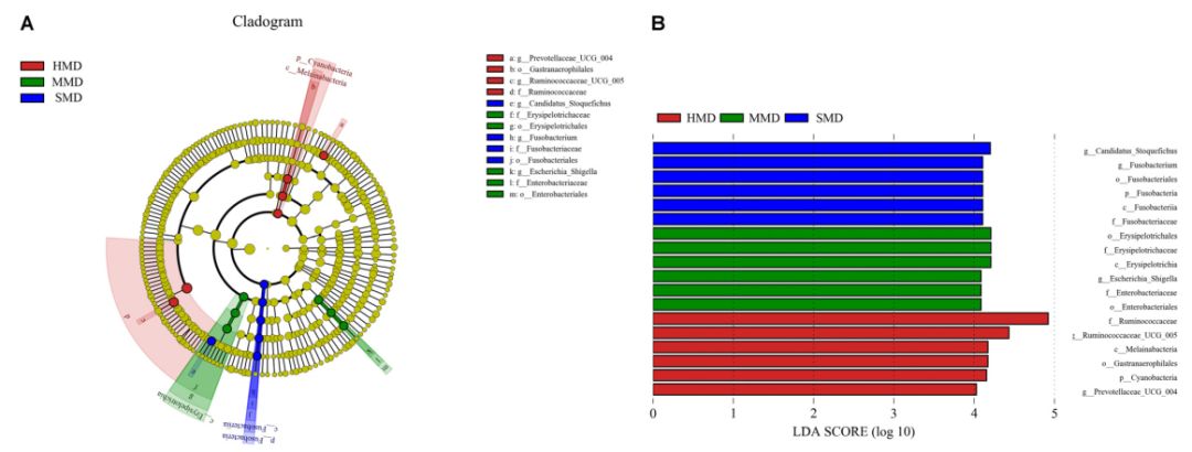LefSe分析表明(圖7),在屬的水平上,MMD組與HMD和SMD組之間顯著性差異較大的菌種為埃希氏菌?–?志賀氏菌。埃希氏菌屬?–?志賀氏菌是常見的病原體,其主要的傳播途徑包括:受感染對象的糞便、食物和含有細菌的水。該病原體可引起結(jié)腸粘膜炎癥,導致腹痛、腹瀉和形成粘膜糞便等癥狀。因此,用于喂養(yǎng)麝的食物和水以及糞便管理是減輕輕度腹瀉的關(guān)鍵。另外,SMD組與HMD和MMD組之間顯著性差異較大的菌種為梭桿菌。梭桿菌是炎癥性微生物,它可抑制體內(nèi)T細胞應答并促進炎性因子的表達。比較MMD組和SMD組,可以推測Fusobacterium可能在輕度腹瀉的背景下增殖并成為主要病原體。因此,森林麝的腸道生理紊亂與其主要病原體的類型是存在一定的相關(guān)性的。