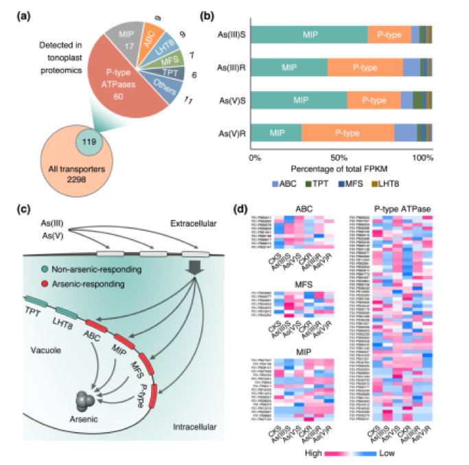 通過使用全長轉錄本構建蛋白數(shù)據(jù)庫,對液泡膜蛋白進行重新注釋,共找到13,595液泡膜蛋白肽段,比對到1,512個轉錄本,其中鑒定到包括P-type ATPase、MIP、MFS、ABC、丙糖-磷酸鹽和賴氨酸-蘇氨酸轉運受體8等6個轉運家族在內(nèi)的119個液泡膜轉運蛋白。其中有四個轉運蛋白家族表現(xiàn)出高表達水平且與砷處理應答有關:絕大多數(shù)的 MIP和P-type ATPase轉運蛋白有著更高的表達水平,而ABC和 MFS轉運蛋白則在砷刺激后在地上部或根部表達上調(diào)。以上結果表明這些轉運蛋白家族在液泡膜上對砷的超富集起到重要作用。