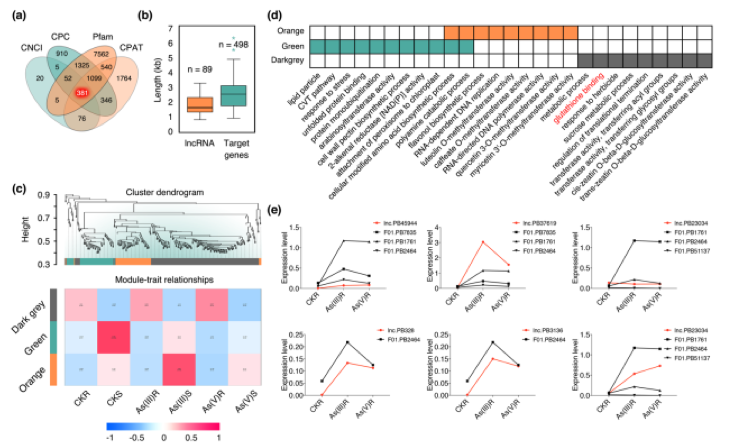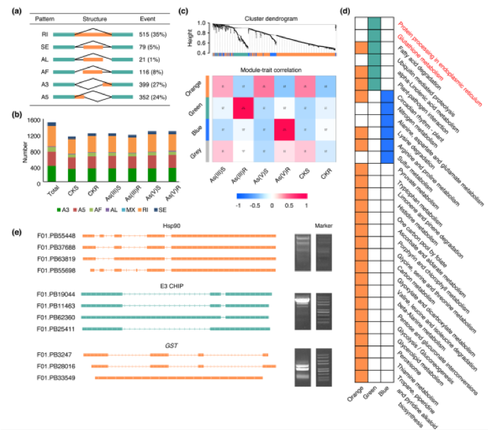 本研究共鑒定到1,482個可變剪接事件,并分為六類包括:內(nèi)含子保留(RI)、外顯子跳躍(SE)、最后外顯子可變剪切(AL)。第一外顯子可變剪切(AF)、3’端可變剪接位點(A3)和5’端可變剪接(A5)。WGCNA分析結果共分為四個模塊(橙色、綠色、藍色,灰色)。在地上部,所有樣本都與橙色模塊相關,而在根部,綠色模塊與As(III)R顯著相關,藍色模塊與AS(V)R顯著相關。對不同模塊進行KEGG富集分析得知,內(nèi)質(zhì)網(wǎng)蛋白質(zhì)加工通路和GSH代謝兩個最重要的通路,顯著富集在綠色模塊。通過PCR對相關可變剪切進行鑒定,結果表明可變剪切極大的豐富了轉錄本的數(shù)量,在錯誤折疊蛋白降解過程和GST的表達上起調(diào)控作用。