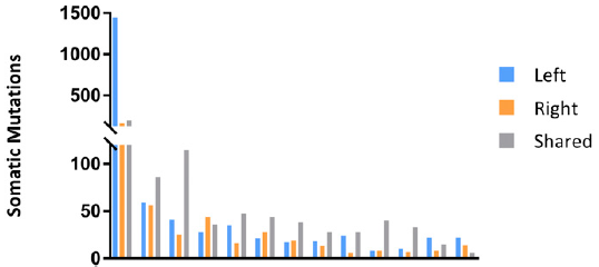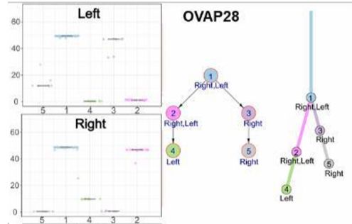 2、研究者也對13對雙側(cè)卵巢癌(synchronous bilateral ovarian cancer,SBOC)進(jìn)行了測序,評估腫瘤克隆進(jìn)化,以確定左右兩側(cè)腫瘤是否獨立地作為2個不同的腫瘤,還是分別代表原發(fā)性和轉(zhuǎn)移性腫瘤。分析表明,體細(xì)胞突變在2側(cè)腫瘤廣泛共享,所有病例中均顯示2側(cè)腫瘤起源于共同的祖先。