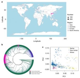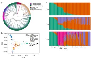 作為較早的異源多倍體作物之一,B.napus通過B. rapa和B.oleracea雜交形成,估計甘藍(lán)型油菜(B.napus)的形成時間為~6700和~7500年前及38000-51000年前。文獻(xiàn)中記載,冬季甘藍(lán)型油菜首次在歐洲種植,大約在1700年,春季甘藍(lán)型油菜開始種植并在18世紀(jì)末傳播到英國,半冬生態(tài)型主要在中國種植,在1930 – 1940年間從歐洲引入。然而,并沒有真正已知的野生甘藍(lán)型油菜(B.napus)群體,導(dǎo)致雜交形成B.napus的兩個祖先種的√確身份仍然難以捉摸,因為B. rapa和B. oleracea具有形態(tài)多樣的亞種,并且通常在整個歐洲種植了幾百年。這些物種之間的天然雜交偶然性地在適當(dāng)?shù)臈l件下發(fā)生。雖然最近的一項研究表明甘藍(lán)型油菜(B.napus)的A亞基因組可能來源于歐洲蕪菁(B. rapa ssp. rapa)的祖先,但是由于僅5份B.napus和27份?B. rapa種質(zhì)被納入該項分析中,因此需要提供更多支持該結(jié)論的證據(jù)。先前基于細(xì)胞核和葉綠體標(biāo)記的研究也表明,甘藍(lán)型油菜可能是從蘿卜和西蘭花之間的種間雜交發(fā)育而來,或是由幾個獨立的雜交事件形成的。為了進(jìn)一步了解甘藍(lán)型油菜的進(jìn)化,有必要揭示野生種或馴化種的供體是否是親本祖先,其中B. rapa和B. oleracea亞種參與甘藍(lán)型油菜的形成。