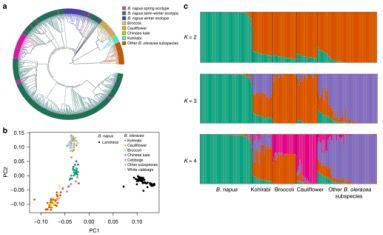 基于*佳模型(Bna, BraA和BolC SNPs集合分別采用GTR+F+ASC+R5, GTR+F+ASC+R7?和?TVM+F+ASC+R8模型),利用IQ-TREE構(gòu)建(ML) trees(圖1a,2a,3a),結(jié)果顯示,B. napus和B. rapa,B. oleracea各自具有一個分枝。大部分甘藍(lán)型油菜(B.napus)依據(jù)生態(tài)型聚類到一起,而B. rapa和B. oleracea的聚類主要反映了亞種間的關(guān)系。BraA的系統(tǒng)發(fā)育關(guān)系顯示,甘藍(lán)型油菜(B.napus)的親緣關(guān)系更接近于European turnip(歐洲蕪菁),并與B. rapa?ssp.?rapa?(亞洲蕪菁)及其它亞種親緣關(guān)系較遠(yuǎn)(圖2a),而這正與最近的一項研究結(jié)果相一致,即甘藍(lán)型油菜(B. napus)的A亞基因組是從歐洲蕪菁的祖先進(jìn)化而來的;通過動態(tài)演化情境模擬進(jìn)一步分析顯示,在大約~106-1,170年前,從歐洲蕪菁到甘藍(lán)型油菜A亞基因組發(fā)生了基因交流(fastsimcoal2);PCA主成分分析顯示,甘藍(lán)型油菜地方品種(B. napus?landraces,n = 50,1980年前登記)更接近歐洲蕪菁(n = 33)(圖2b)。群體結(jié)構(gòu)分析顯示,當(dāng)K=2時,為佳的分群數(shù)(圖2c),其明確的將甘藍(lán)型油菜的地方品種與歐洲蕪菁分開,進(jìn)一步支持了甘藍(lán)型油菜A亞基因組的進(jìn)化歷史。