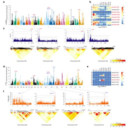 為了鑒定與11個農(nóng)藝性狀相關(guān)的候選基因,研究人員利用了多位點隨機(jī)混合線性模型mrMLM v1.3進(jìn)行全基因組關(guān)聯(lián)分析研究(genome-wide association studies)。為了獲得高質(zhì)量的SNPs,研究人員對Bna SNP集合進(jìn)行了估算,保留了670,028個SNP,MAF> 5%,用于后續(xù)的GWAS分析。通過19個樣品多態(tài)性核苷酸和Sanger測序結(jié)果的評估比較,表明98.74%的推算基因型是正確的,20份種質(zhì)的兩個生物學(xué)重復(fù)推算的與真實的基因型的平均系數(shù)(r2)為0.956,最小值和最大值范圍從0.928到0.967,進(jìn)一步證實推算的基因型的z確性。最終共計鑒定了與10個目標(biāo)性狀顯著相關(guān)的60個位點,其中5個與種子產(chǎn)量相關(guān),3個與長角果長度相關(guān),4個與油脂含量相關(guān),48個與種子質(zhì)量相關(guān)(圖4c),此外,3個位點在閾值范圍內(nèi)顯示與開花時間相關(guān),與種子質(zhì)量性狀顯著相關(guān)的SNPs解釋了14.30%?到35.47%的表型變異,高于種子產(chǎn)量(16.81%)和含油量(20.64%),此外,本研究中還檢測到與先前的GWAS研究中與種子質(zhì)量相關(guān)的大部分基因座。由于與油含量和產(chǎn)量的相關(guān)性狀是復(fù)雜的并容易受到環(huán)境變化影響,研究人員將本研究中重要的基因座位與前期研究的QTLs位點進(jìn)行了整合。因此,在受選擇區(qū)與QTLs定位區(qū)域內(nèi),基于功能注釋和轉(zhuǎn)錄組分析控制不同性狀的候選基因被鑒定,如下分析。