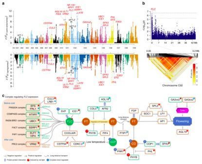 研究人員在FLOR-ID(FLOweRing Interactive Database)中檢索到了306個基因與擬南芥開花時間相關(guān),在甘藍(lán)型油菜中鑒定了1,225個直系同源基因。在兩組比對中,24?個開花時間相關(guān)基因同時坐落在受選擇區(qū)域中(圖5a,c),其中22個分布在C亞基因組上,主要通過春化和光周期途徑調(diào)節(jié)開花時間。特別地,FLC基因座及其染色質(zhì)介導(dǎo)的調(diào)節(jié)原件將是調(diào)控甘藍(lán)型油菜開花時間的*有希望的靶標(biāo)。