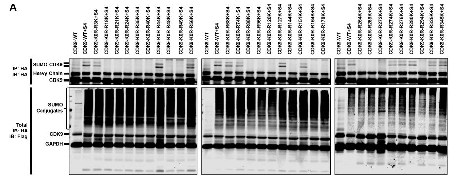 接下來作者試圖鑒定應(yīng)該在CDK9?賴氨酸殘基上發(fā)生的SUMO化位點(diǎn)。賴氨酸突變實(shí)驗(yàn)結(jié)果:CDK9-K0R突變體含有所有賴氨酸變?yōu)榫彼岬耐蛔儯耆兄沽薈DK9被SUMO化的能力;其他CDK9突變體仍然能夠通過TRIM28進(jìn)行SUMO化,這表明在整個(gè)CDK9序列中可能存在多個(gè)SUMOylation位點(diǎn)。采用基于CDK9-K0R全突變體的逆轉(zhuǎn)突變策略,發(fā)現(xiàn)CDK9上的幾個(gè)賴氨酸顯著SUMO化。其中,多個(gè)SUMO化位點(diǎn)與CDK9 C-末端自身磷酸化位點(diǎn)相鄰,據(jù)報(bào)道這些位點(diǎn)是Tat-P-TEFb與TAR RNA高親和力結(jié)合所必需的,即?SUMO化可以通過阻止相鄰的磷酸化來降低結(jié)合能力。