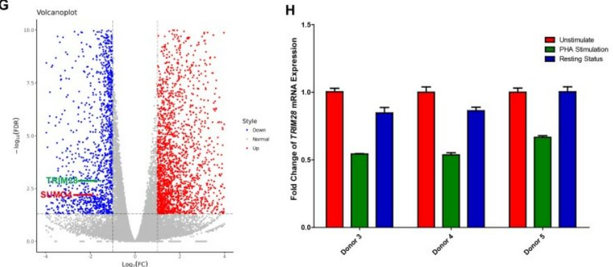 通過實(shí)驗(yàn)發(fā)現(xiàn)si-TRIM28過表達(dá)抑制了HIV-1啟動(dòng)子活性的基礎(chǔ)水平,并以劑量依賴的方式挽救了HIV-1抑制;當(dāng)與HIV-1 Tat和TNFα組合過表達(dá)時(shí),上調(diào)更顯著;TRIM28在多種細(xì)胞系和原代細(xì)胞中普遍表達(dá)。為搜索HIV-1潛伏相關(guān)基因,作者利用RNA-Seq比較未刺激和PHA刺激的原代CD4+?T細(xì)胞中的基因表達(dá)作為補(bǔ)充實(shí)驗(yàn),TRIM28在未刺激的原代CD4+?T細(xì)胞中高表達(dá),并在PHA激活后下調(diào)。當(dāng)活化的CD4+?T細(xì)胞恢復(fù)到靜止?fàn)顟B(tài)時(shí),TRIM28的表達(dá)再次上調(diào)。為了測(cè)試TRIM28是否有助于HIV-1潛伏,在HIV-1潛伏細(xì)胞系J-Lat 10.6以及其他HIV潛伏細(xì)胞系模型(J-Lat 6.3/8.4/9.2和15.4)中敲低了TRIM28,發(fā)現(xiàn)TRIM28的缺失上調(diào)了HIV-1的表達(dá)。此外,當(dāng)補(bǔ)充廣泛定義的LRA:組蛋白去乙?;福℉DAC)抑制劑SAHA或BET結(jié)構(gòu)域抑制劑JQ-1時(shí),HIV-1重新激活增強(qiáng)得更高。