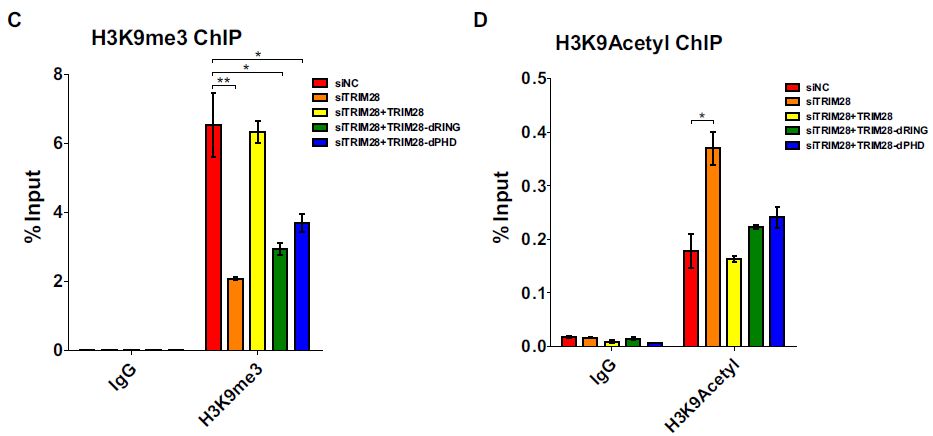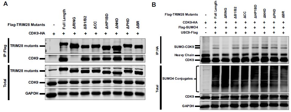 免疫共沉淀(Co-IP)實(shí)驗(yàn)發(fā)現(xiàn)即使在RNase存在下CDK9也與TRIM28結(jié)合。為了鑒定TRIM28的哪個(gè)區(qū)域與CDK9結(jié)合,構(gòu)建各種TRIM28缺失突變體以富集CDK9:RING結(jié)構(gòu)域缺失中止了CDK9的結(jié)合以及CDK9的SUMO化。實(shí)驗(yàn)表明外源表達(dá)的TRIM28也與CDK9共定位??傊芯勘砻鱎ING和PHD都具有E3連接酶活性并富集UBC9。