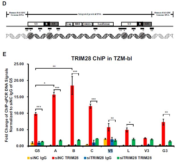 先前已鑒定TRIM28通過募集HDAC1以使HIV-1整合酶去乙?;瘉硪种艸IV-1整合。在TZM-bl和J-Lat 10.6細(xì)胞系中進(jìn)行TRIM28的染色質(zhì)免疫沉淀(ChIP)實(shí)驗(yàn),以研究其與整合的HIV-1 DNA的可能關(guān)聯(lián)。結(jié)果表明:TRIM28在HIV-1 LTR上顯著富集,不受TNFα信號(hào)傳導(dǎo)的影響。接下來,探究了TRIM28缺失是否會(huì)影響HIV-1 LTR的表觀遺傳狀態(tài),敲除TRIM28后H3K9me2和H3K9me3顯著減少,以及H3K4me3和H3K9Ac顯著增加,也誘導(dǎo)H3K27me3輕微下調(diào),表明TRIM28通過控制抑制性表觀遺傳修飾來抑制HIV-1表達(dá)并導(dǎo)致HIV-1潛伏期。