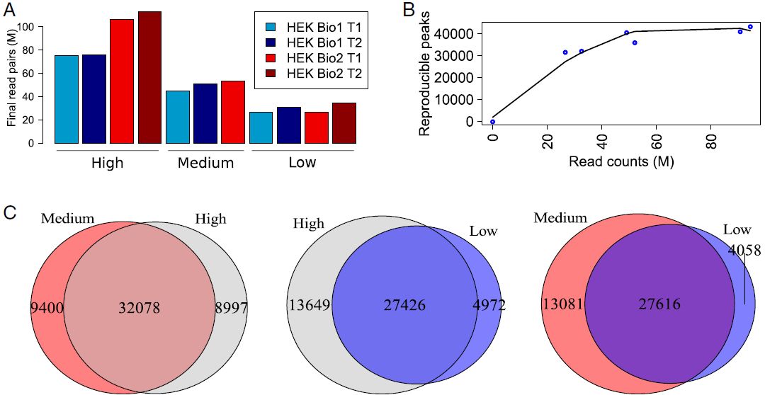 作者還探究了文庫(kù)/測(cè)序深度對(duì)揭示開放染色質(zhì)區(qū)域的影響,高深度和中等深度的ATAC-seq鑒定了相似數(shù)量的peaks,而低深度則略微減少。具有生物學(xué)重復(fù)的低至中等深度25-50Mb reads文庫(kù)足以可靠地鑒定人細(xì)胞系中的開放染色質(zhì)區(qū)域。