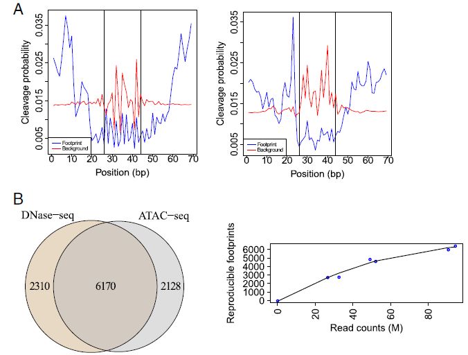 前人研究表明,DNase I酶以非隨機(jī)方式切割基因組DNA,不同序列具有不同的切割傾向,并且這種序列偏差對(duì)未經(jīng)校正的footprinting質(zhì)量有不利影響。作者發(fā)現(xiàn)ATAC-seq和DNase-seq具有不同的序列偏差,但推斷的足跡的位置基本上是一致的。