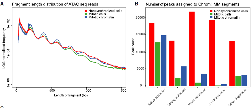 因此作者改進(jìn)了ATAC-seq建庫(kù)方法,以減少mtDNA污染:1)將裂解緩沖液中細(xì)胞裂解的時(shí)間從最初的10分鐘減少到5分鐘;2)直接進(jìn)行轉(zhuǎn)座反應(yīng)不引入加裂解緩沖液步驟。