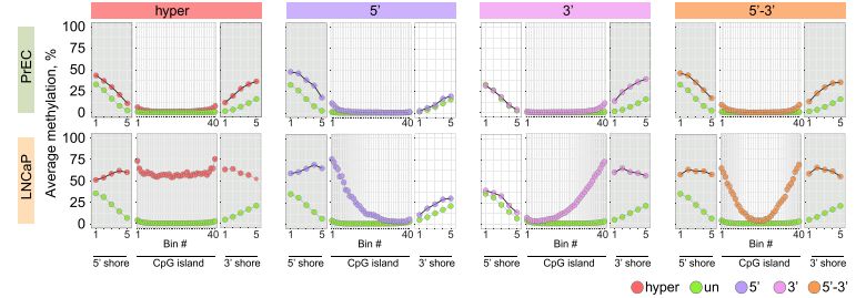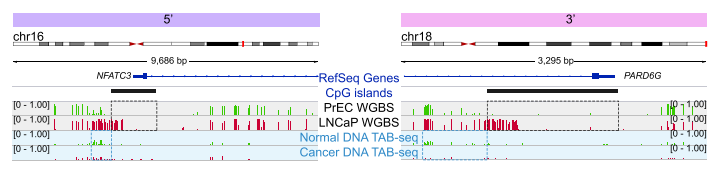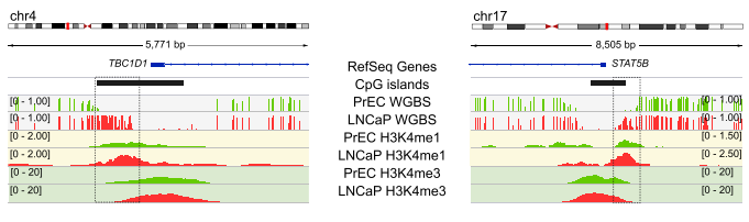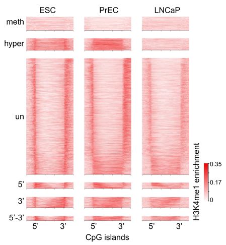采用chip-seq數(shù)據(jù),分析H3K4me1在癌癥CpG島超甲基化中的富集方式。H3K4me1高富集于hESCs CpG島的body區(qū),在癌癥中呈現(xiàn)廣泛超甲基化。相反,癌癥中未甲基化的CpG島,在hESCs中表現(xiàn)為邊界雙峰富集及島區(qū)域降低。并且,文章發(fā)現(xiàn)一種hESCs中不對稱的H3K4me1富集模式,在對應(yīng)5’或3’內(nèi)CpG島邊界,易于癌癥中DNA甲基化。通過可視化圖展現(xiàn)了候選的CpG島,顯示癌癥中5’和3’的甲基化堆積,可以由正常前列腺細(xì)胞中H3K4me1預(yù)先標(biāo)記。
