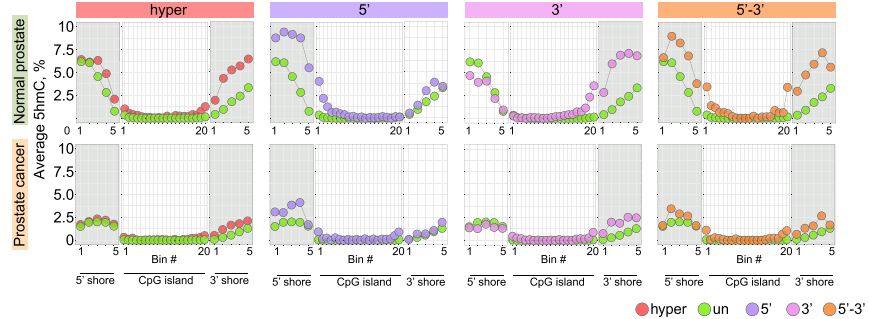 文章結(jié)果發(fā)現(xiàn)在5’或3’不對稱甲基化的CpG島邊界,正常細(xì)胞中具有高甲基化,但廣泛甲基化的或雙向甲基化堆積的CpG島在island shores具有高甲基化水平。正常組織中5hmC對DNA去甲基化及未甲基化CpG島的保護(hù)具有重要作用。此外癌組織中5hmC大范圍的減少可能會參與CpG島的超甲基化。文章采用3對前列腺癌樣本進(jìn)行5hmC與5mC檢測,正常組織中表現(xiàn)出增強(qiáng)的CpG島shores 5hmC水平,且基因CpG島DNA甲基化堆積伴隨shores處5hmC的降低。