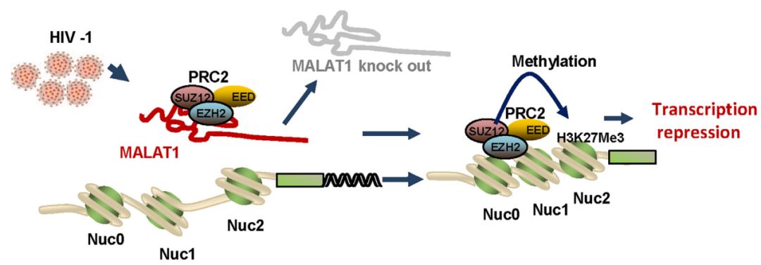 作者在這里發(fā)現(xiàn)MALAT1通過(guò)與PRC2的結(jié)合,將EZH2從與HIV-1 LTR啟動(dòng)子的結(jié)合中分離出來(lái),從而清除了PRC2 復(fù)合物介導(dǎo)的組蛋白H3第27位賴氨酸上的三甲基化(H3K27me3),進(jìn)而緩解了HIV-1轉(zhuǎn)錄的表觀遺傳沉默。此外,用潛伏期逆轉(zhuǎn)劑(LRA)刺激HIV-1的再激活可誘導(dǎo)潛伏感染細(xì)胞中MALAT1的表達(dá)。成功的聯(lián)合抗逆轉(zhuǎn)錄病毒療法(cART)的患者伴有MALAT1表達(dá)顯著減少,說(shuō)明MALAT1表達(dá)與HIV-1復(fù)制呈正相關(guān)。因此作者的研究確認(rèn)了MALAT1對(duì)HIV-1轉(zhuǎn)錄的促進(jìn)作用,且MALAT1可能是新療法的潛在靶點(diǎn)。