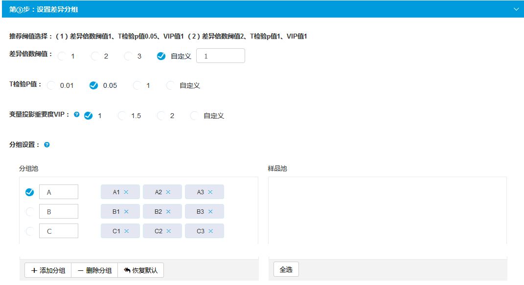 設置差異分析的條件:包括差異倍數(shù)、T檢驗p值、VIP值、以及差異分組