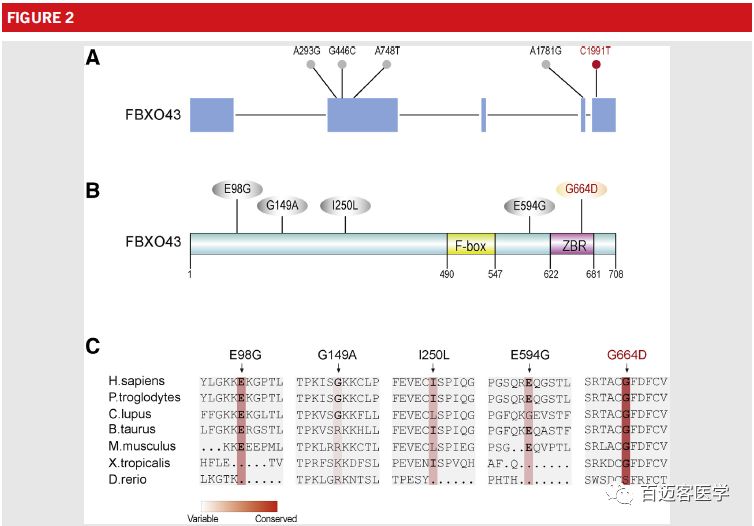 (注:該圖中除C1991T(G664D)外,其他突變?yōu)樵谏l(fā)樣本中發(fā)現(xiàn)的FBXO43基因突變)