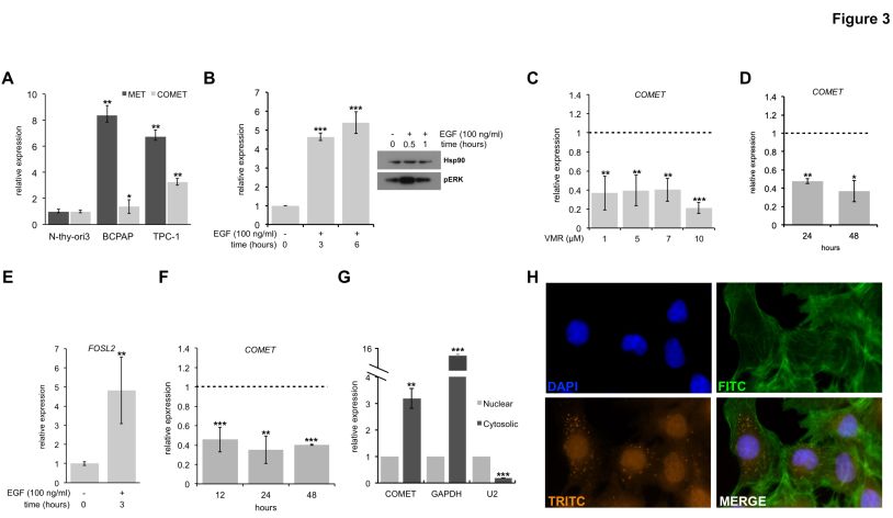 BRAF樣PTC的特征在于ERK介導的轉(zhuǎn)錄程序的過度激活。這一點促使研究COMET表達是否在MAPK激活下游被誘導。因此,用表皮生長因子(EGF)刺激Nthy-ori 3-1細胞中的RAS-RAF-MEK-ERK途徑。MAPK途徑的誘導 – 通過早期p-Erk增加證實(圖3B,右圖) – 隨后COMET水平顯著增加(圖3B,左圖)。相反,使用化學和遺傳方法抑制BRAF突變的BCPAP細胞系中的組成型活性途徑,通過用vemurafenib阻斷過度活化的B-Raf蛋白(圖3C)或BRAF基因KD(圖3D),顯著降低COMET水平。之后評估了COMET細胞定位,與qPCR偶聯(lián)的RNA分級分析顯示,與內(nèi)參蛋白質(zhì)編碼基因(GAPDH)類似,COMET在細胞質(zhì)RNA部分中具有明顯富集(圖3G)。此外,RNA FISH進一步證實了這種新的NAT lncRNA的細胞質(zhì)定位(圖3H)。