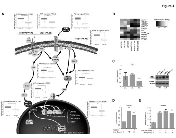 為了預測COMET的功能并確定其在乳頭狀甲狀腺癌中的潛在生物學意義,基于共犯原則進行分析。利用基于TCGA的lncRNA圖譜TANRIC,使用Pearson相關性評估甲狀腺癌樣本中的COMET表達是否與其他基因的表達相關。與初步發(fā)現(xiàn)一致,用鄰近癌基因MET檢測出最高相關值(r = 0.88)。此外,對與COMET顯著相關(FDR <0.05;r≥0.7)的基因進行的通路分析顯示MAPK通路的富集,并且有趣的是,其中一些在來自TCGA的PTC樣品的BRAF樣群中過表達( 圖4A)。