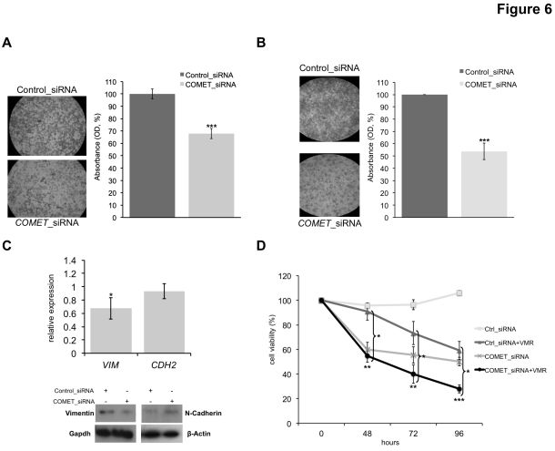據(jù)報道,受體酪氨酸激酶(RTK),特別是c-Met受體的激活是腫瘤細胞逃避vemurafenib(VMR,維莫非尼)介導的突變體B-Raf蛋白抑制的機制。由于作者數(shù)據(jù)支持COMET可作為MET新的調(diào)節(jié)劑,猜測它是否也可能作用于BRAF突變的腫瘤細胞中的vemurafenib反應機制。首先,與TPC-1細胞類似,評估COMET沉默對BRAFV600E突變的BCPAP細胞系的生存力(高達50%)具有強烈影響(圖6D),伴隨MET水平的下降。當用VMR處理BCPAP時,也表現(xiàn)出了類似的效果(高達60%的細胞存活率降低)。因此,將敲低COMET的BCPAP細胞暴露于VMR,以評估組合治療是否可發(fā)揮累加效應。有趣的是,圖6D中數(shù)據(jù)表明,與對照細胞(即僅用VMR處理和/或用對照siRNA轉(zhuǎn)染的細胞,圖6D)相比,COMET敲低的 BCPAP細胞具有顯著增強的VMR敏感性,表明在BRAFV600E突變腫瘤中COMET是提高化療的新靶標。