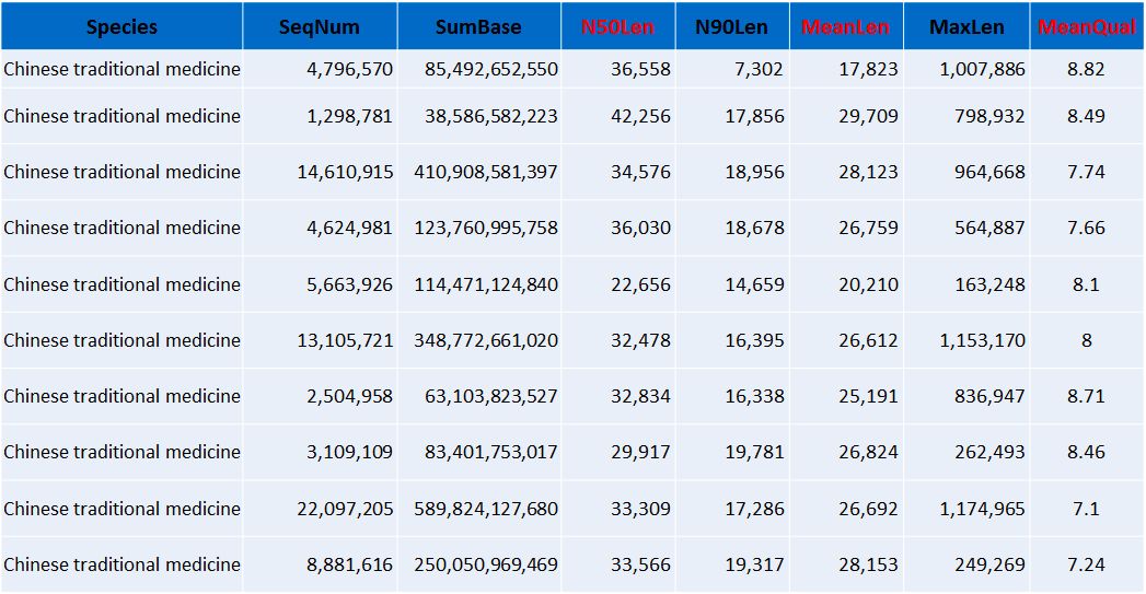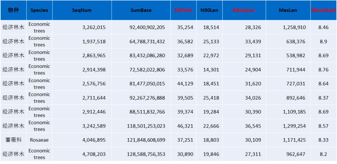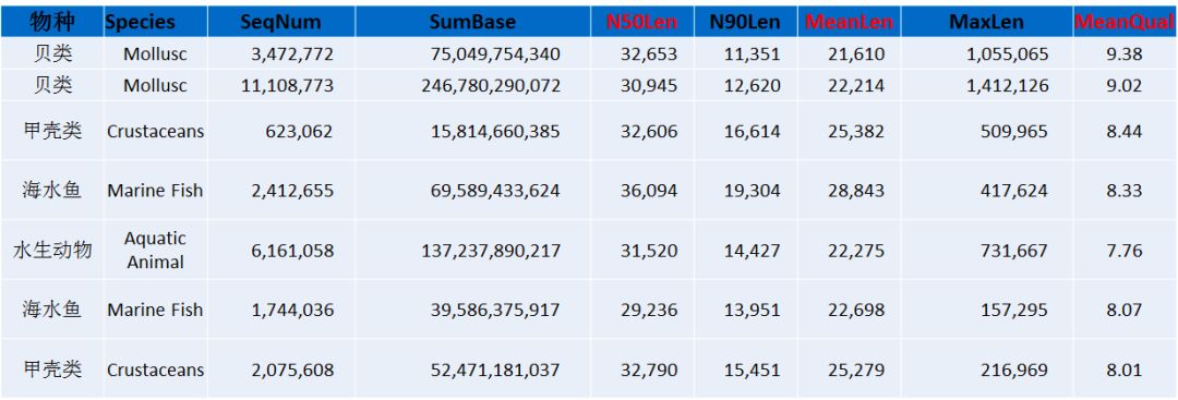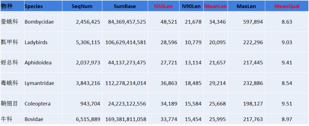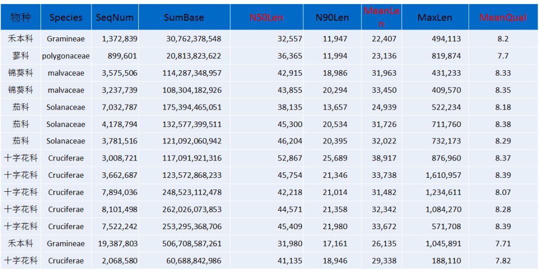 注:Species:分析的物種信息;SeqNum:各個(gè)長度范圍內(nèi)序列的數(shù)目;SumBase:指各個(gè)長度范圍內(nèi)序列的總長度;N50Len:reads N50長度;N90Len:readsN90長度;MeanLen:平均reads長度;MaxLen:最長reads長度;MeanQual:質(zhì)量值。