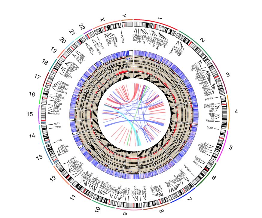 Circos圖是在基因組相關(guān)的分析結(jié)果展示中非常常見的一類圖型。由于Circos圖中展示的信息量大,圖形十分美觀,很多文章中都會繪制類似的圖形。從圖形的內(nèi)容來看,Circos圖實際是將多個類型的圖片,包括散點圖、直方圖、折線圖、熱圖等,經(jīng)過變形以后疊加顯示在染色體上。本質(zhì)上是多個圖形的組合。